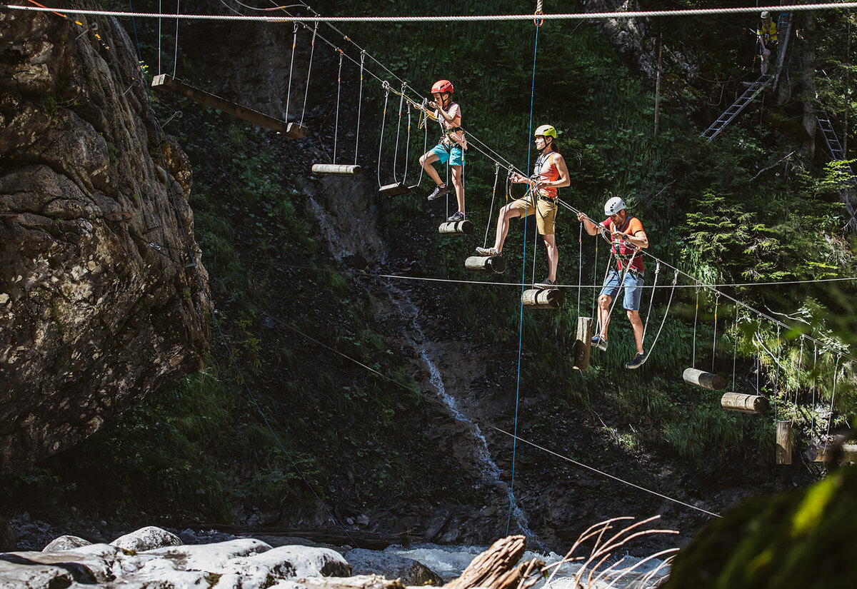 Erleben Sie Abenteuer im Hochseilgarten am Arlberg mit 42 Seilparcours, 3 Flying Fox und einem Mega Swing! Für Kinder ab 6 Jahren, Jugendliche und Erwachsene bieten die Parcours abwechslungsreiche Herausforderungen inmitten der Natur. Über Wildbäche, natürliche Felsen und durch duftende Wälder – jedes Abenteuer passt sich individuell an.