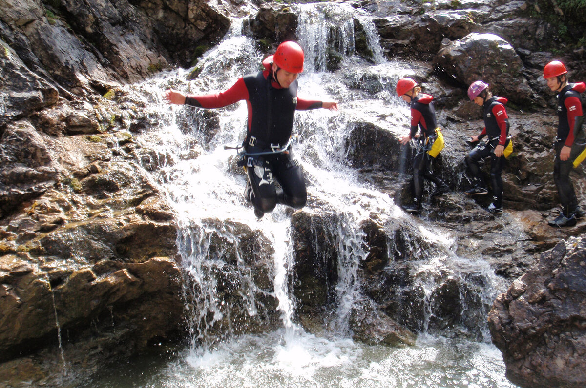 Erleben Sie ein unvergessliches Naturabenteuer beim Canyoning in Warth-Schröcken! Gleiten Sie über Felsen, schwimmen Sie im klaren, türkisfarbenen Wasser und entdecken Sie beeindruckende Wasserfälle in malerischen Schluchten.